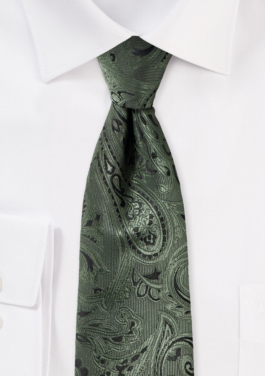 Your formal black-tie wedding calls for a stunning tie in moss green with paisley patterning like this one. We use a dense weaving technique to incorporate the green paisley pattern into the fabric, and we add black to further define the pattern. The finished product is a necktie with a delicate texture that shimmers gorgeously in the light. We suggest that you wear a white shirt with a black suit or tux. We would appreciate it if you could take a look at our bow ties and pocket squares made from the same cloth.