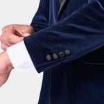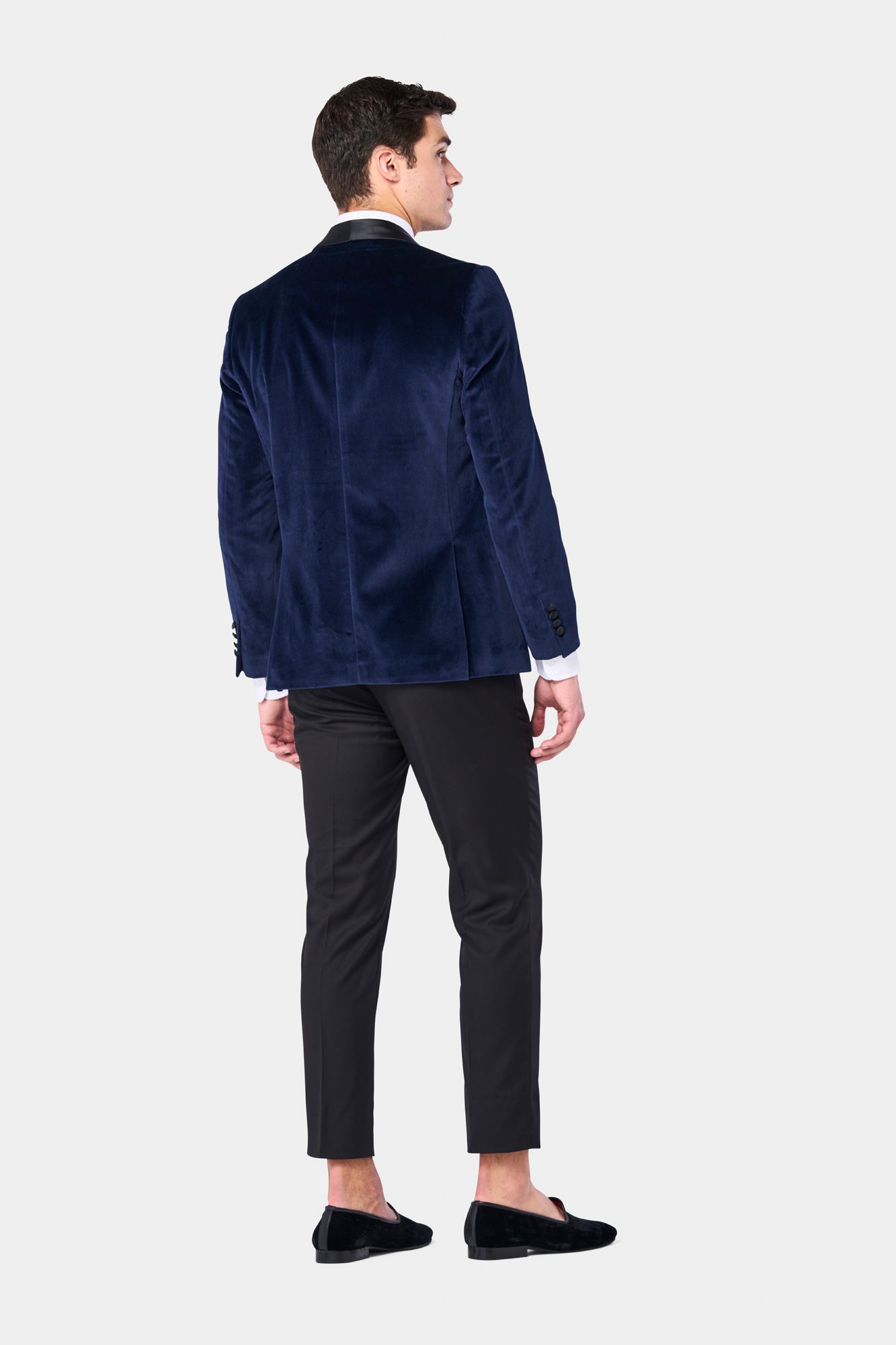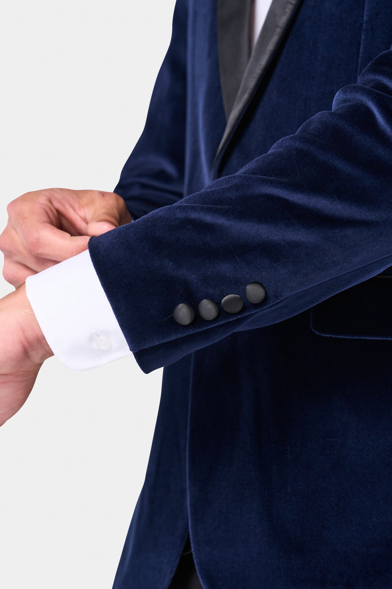 Skillfully tailored from luxurious cotton velvet, the soft, dense fabric maintains the jacket's slim, tailored shape. The navy blue hue exudes sophistication, perfect for making a stylish impression at formal black tie events. The dynamic color elevates the velvet fabric for a look that commands attention.