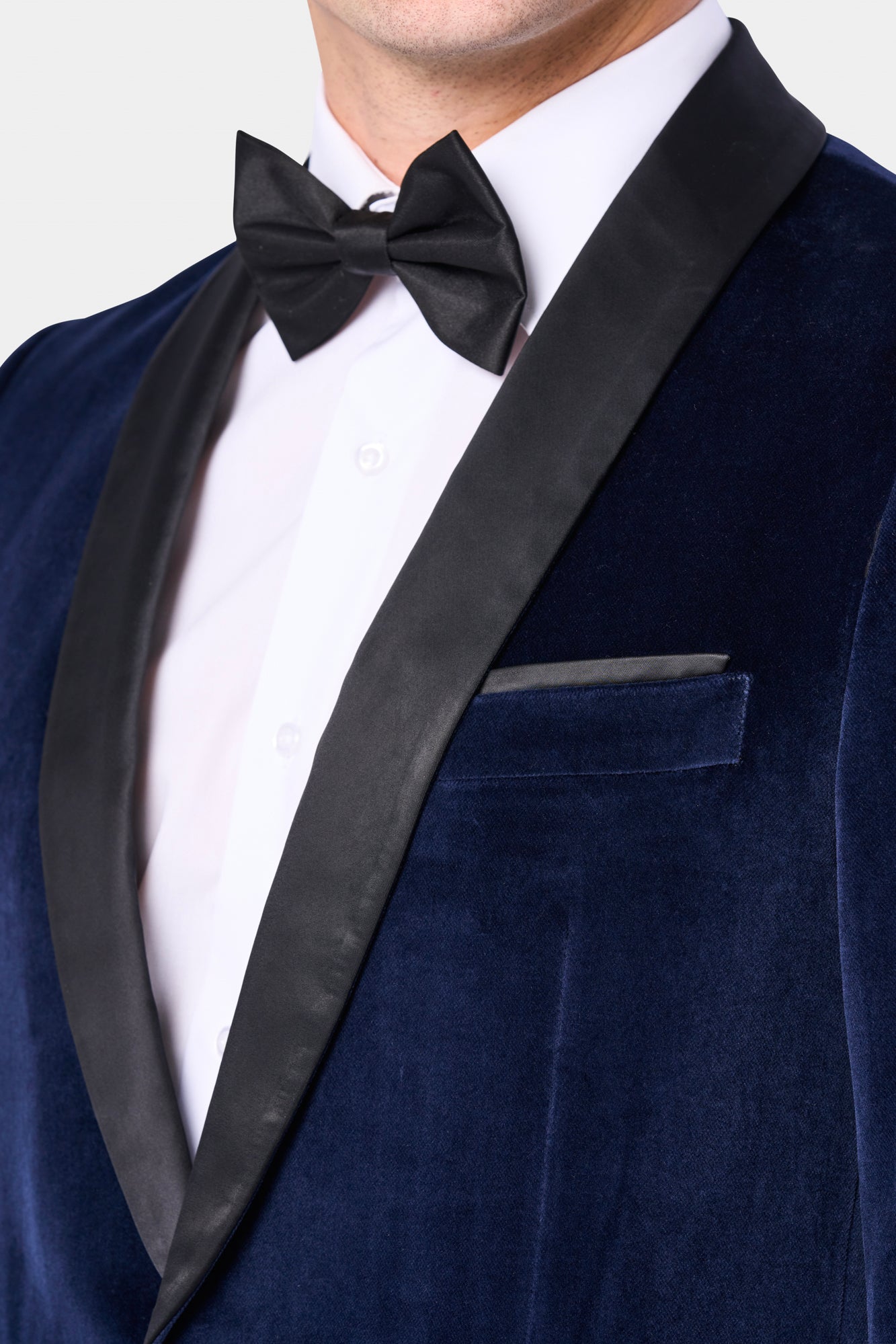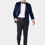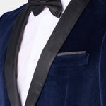 Look stylish and confident in this navy blue velvet shawl collar tuxedo, meticulously designed for today's fashionable gentleman. Cut for special occasions; this tuxedo features a slim-fit single-button velvet jacket with a striking shawl collar and matching velvet pants for an elegantly bold look. In addition, the navy blue velvet shawl lapel tuxedo is perfect for weddings and formal occasions.