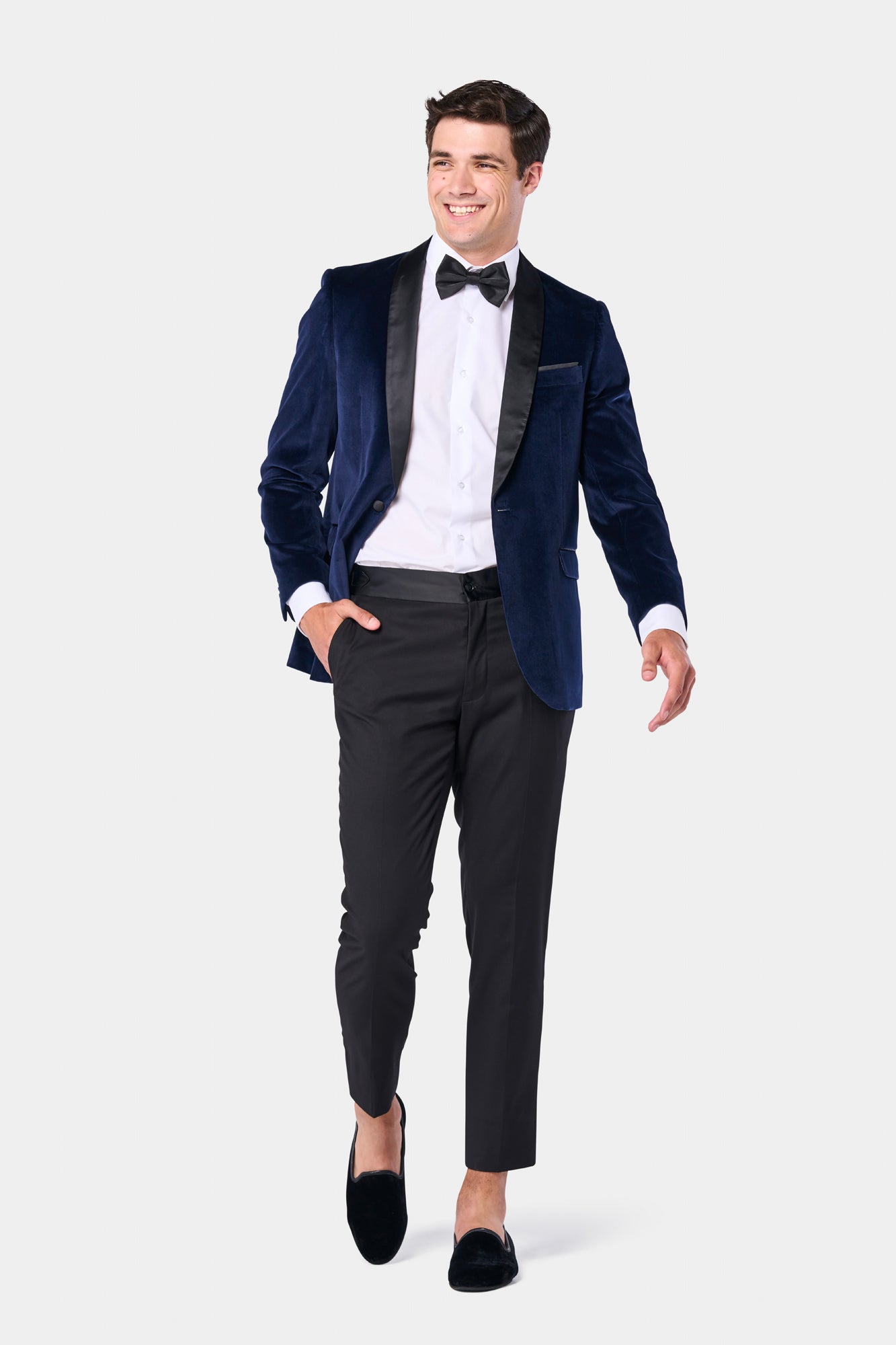 In addition, the navy velvet tuxedo provides a vibrant foundation to craft an elegantly bold black tie ensemble. For classic flair, complement it with a white tux shirt, black bow tie, and patent leather shoes. For a creative edge, pair it with a bold shirt, metallic vest, and bit loafers. Notwithstanding how you style it, this tuxedo has you looking confidently dapper.