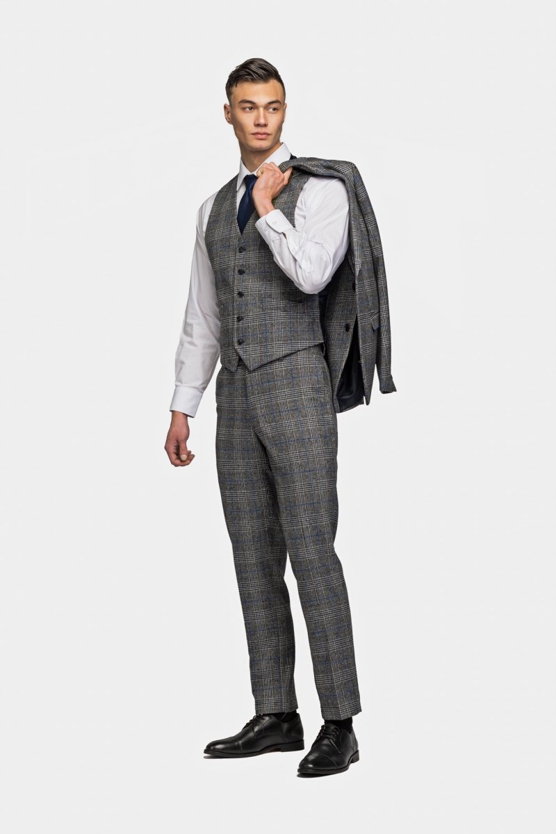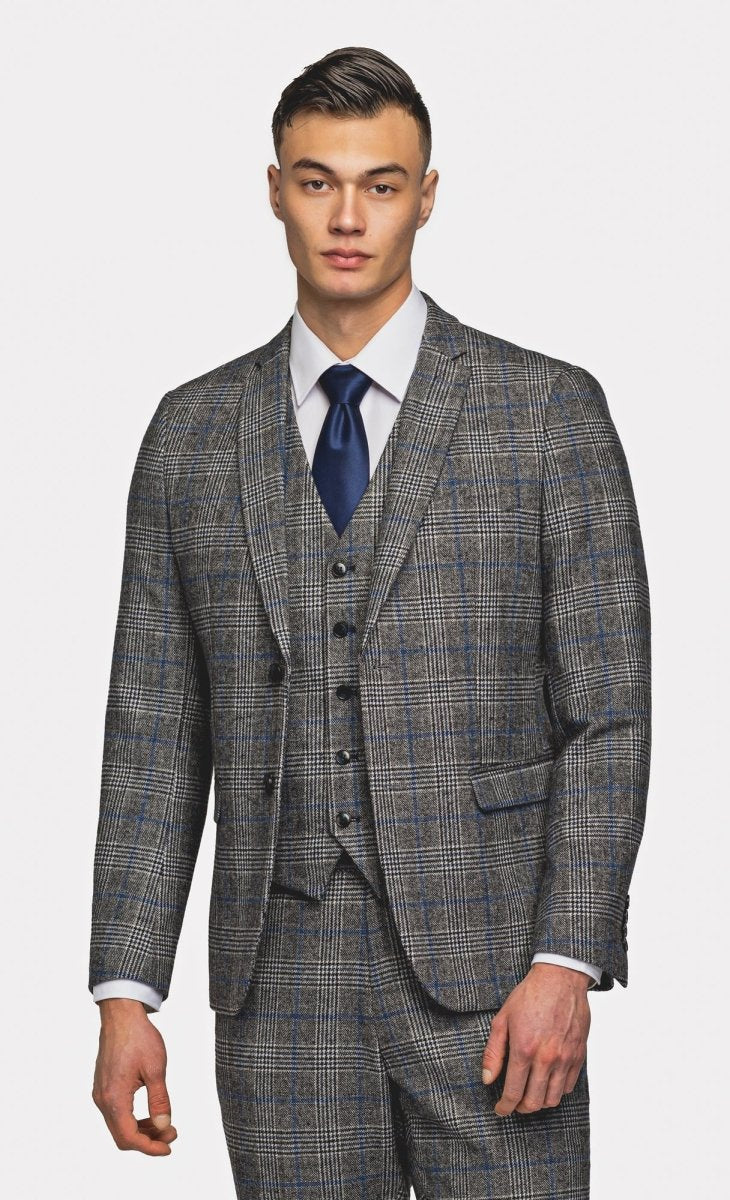 With its stunning gray-blue plaid pattern, meticulous slim-fit tailoring, and warm and fuzzy fabrics that retain shape, this three-piece suit is fashionable and classy. Whether it is a work meeting, a wedding, or a formal occasion, our gray-blue flannel plaid three piece suit is for any event and will make you look stylish.