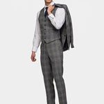 Featuring a gray-blue plaid pattern, the suit adds a touch of warmth and charm to your look, regardless of the season. Also, the jacket has a classic notch lapel collar and a two-button closure for a sleek and sophisticated look. The vest has a five-button closure and two front pockets for some functionality and style. Also, the jacket has padding at the shoulders and four-button cuffs for added panache. Also, the trousers are un-hemmed, and you can easily customize them to your length.