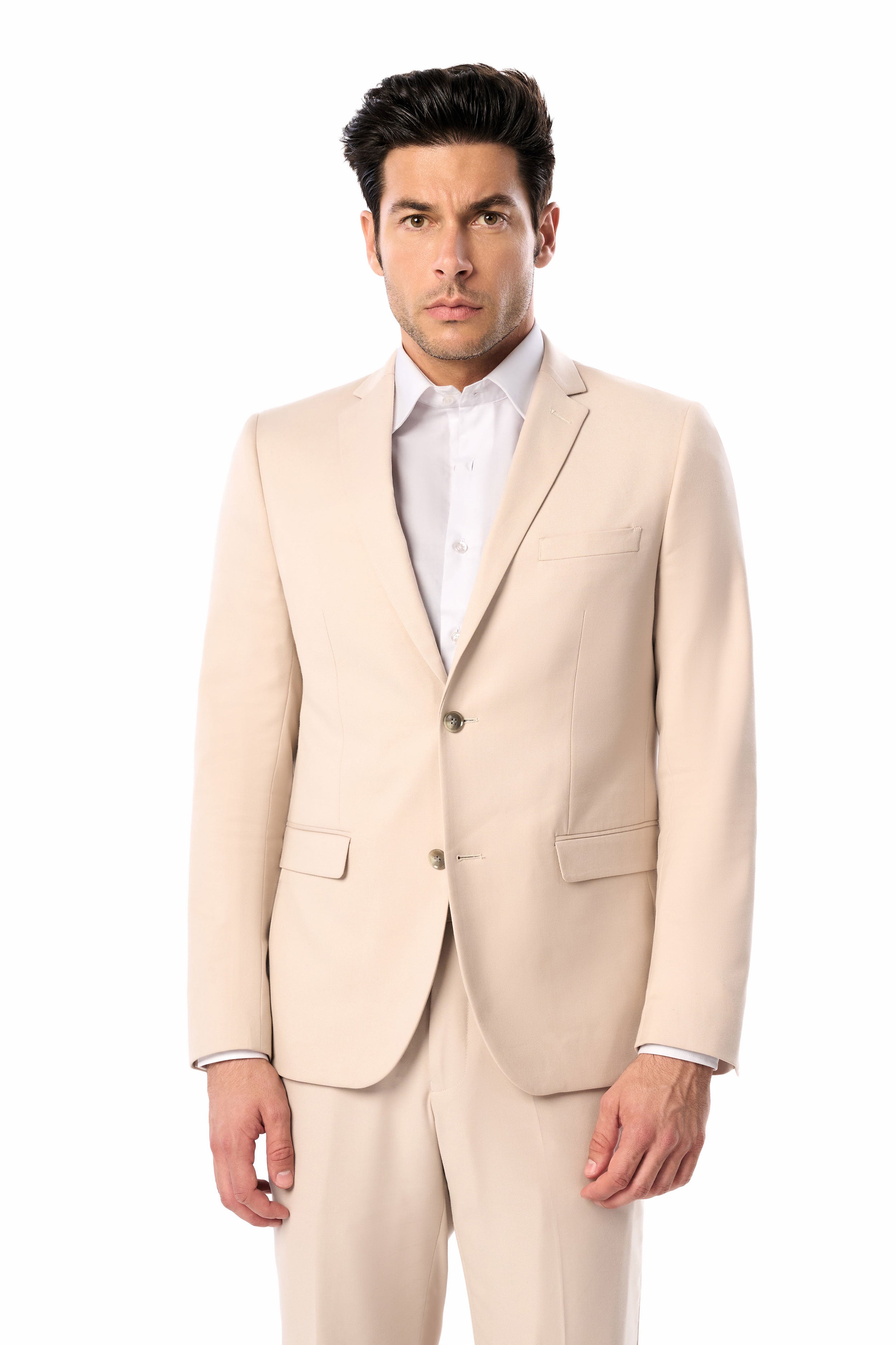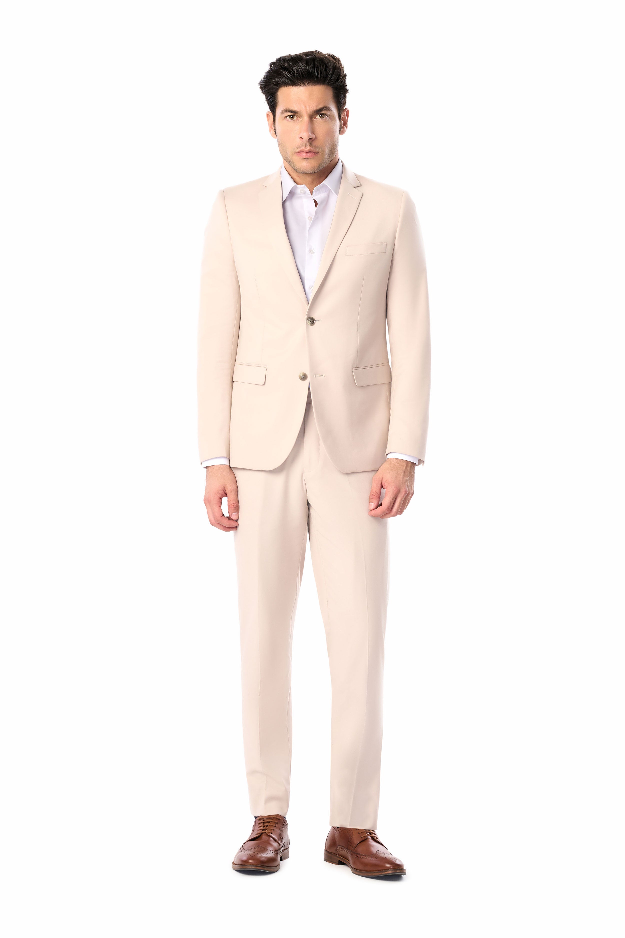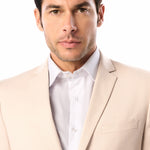 Embody enduring elegance in this polished tan two-button suit, expertly designed for both comfort and versatility. Designed for today's fashionable yet practical gentleman, this suit features a classic notch lapel collar and two-button closure, creating an impressively polished silhouette. Tailored from our fine polyester-rayon and spandex blend, the suit is fashionable and comfortable and will make you look dapper and exquisite anytime you wear it.