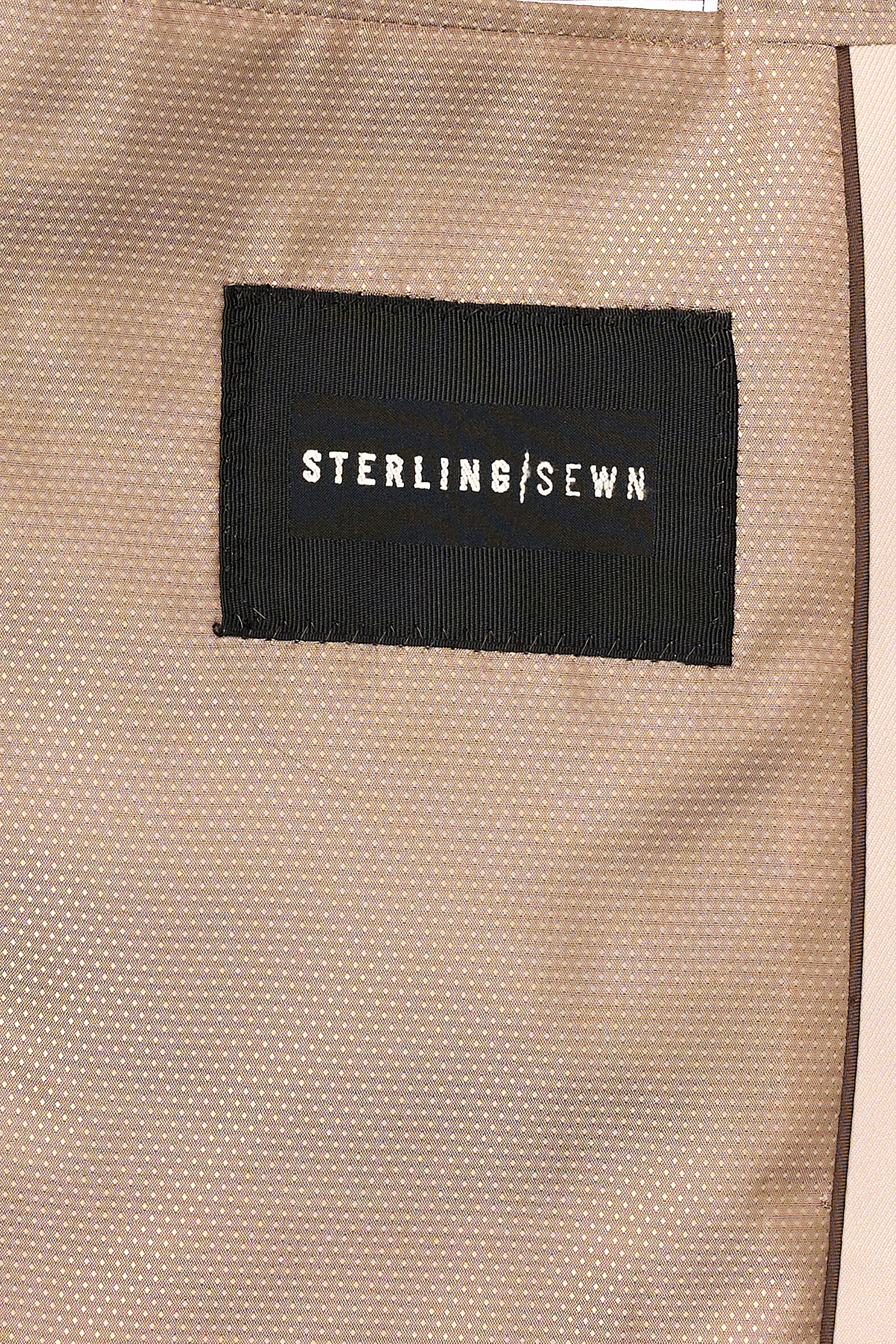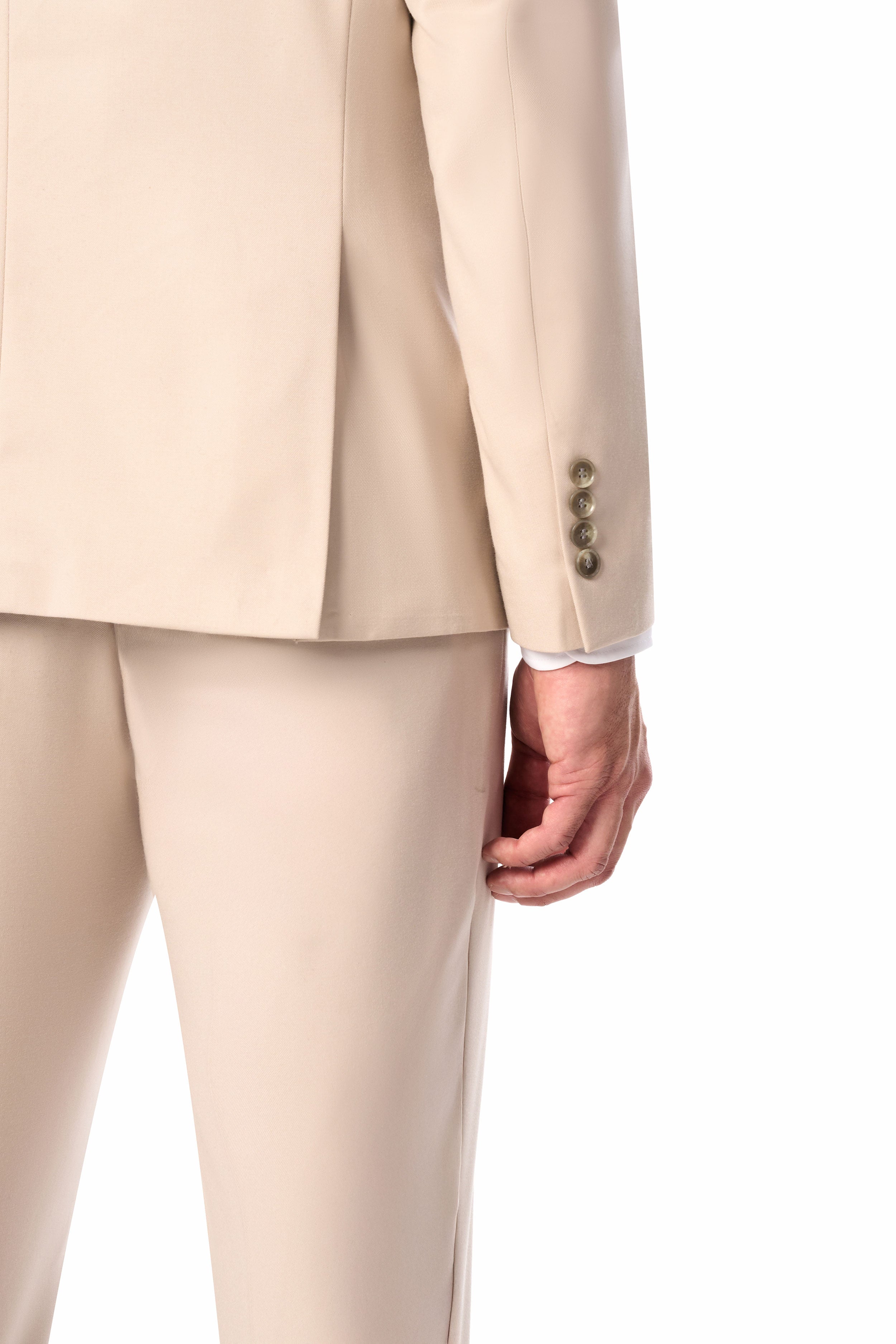 The jacket is expertly tailored with structured shoulder padding, maintaining its well-defined shape. A traditional two-button front closure provides understated refinement. The matching flat-front pants are precisely cut to sit flawlessly at the hips with unfinished hems, ready for custom tailoring. Also, the suit has a beautiful tan hue that can be effortlessly matched with any color to shape your look, no matter the season.