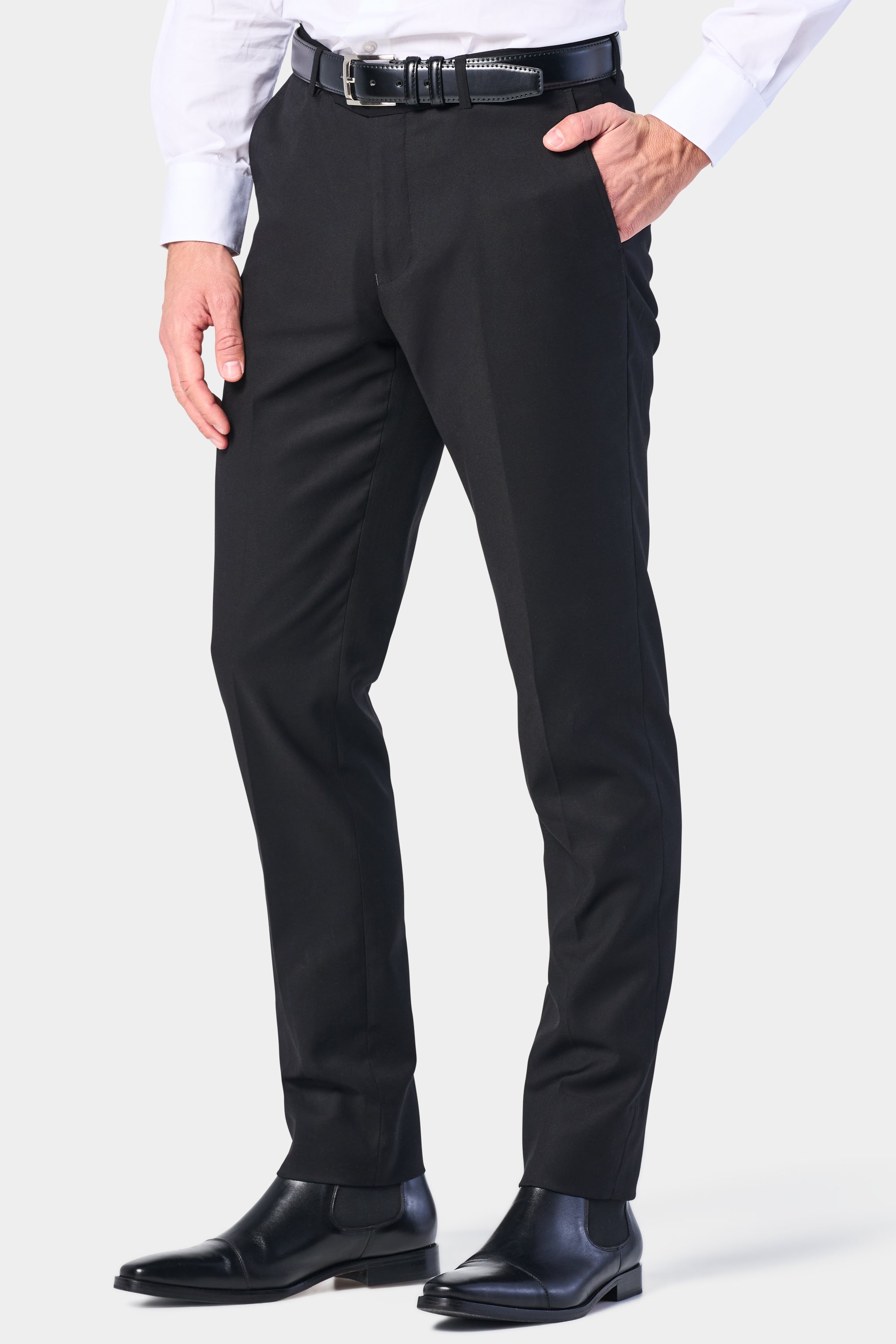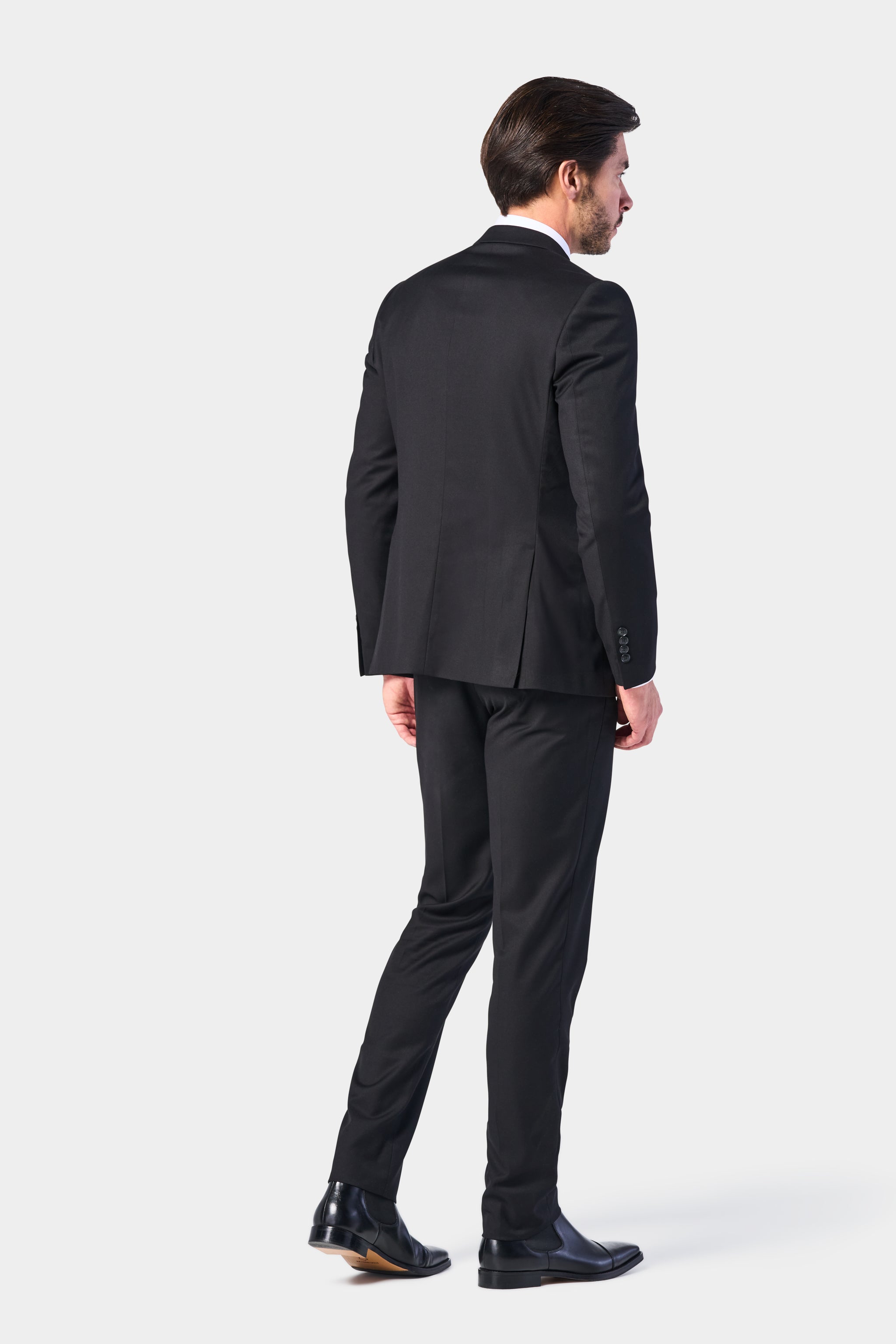 With its simple modern cut and timeless color, this classic black two-button suit is designed to make you look sophisticated and confident. It's a staple piece for any well dressed gentleman's wardrobe. Whether you wear it to work, a wedding, or a meeting, the suit will help you exude professional style and confidence whenever you wear it.
