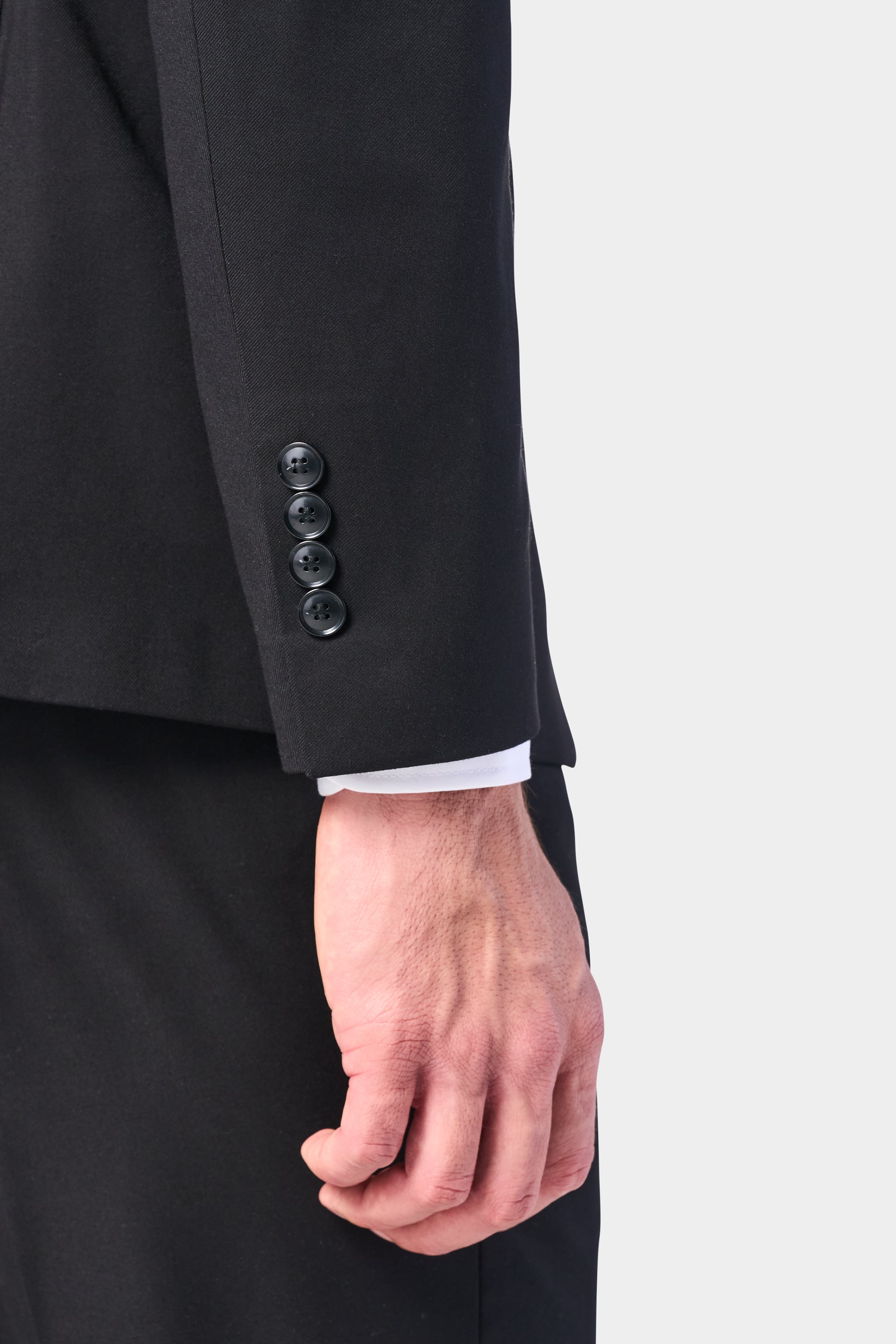 Details and Features The single-breasted jacket features a shawl lapel and four-button detailing on the sleeves. It has a slim fit to highlight your physique and elevate your look. The jacket also has jetted pockets, a chest pocket, and no vents in the back. The pants are unhemmed, so you can customize them to your preferred length.