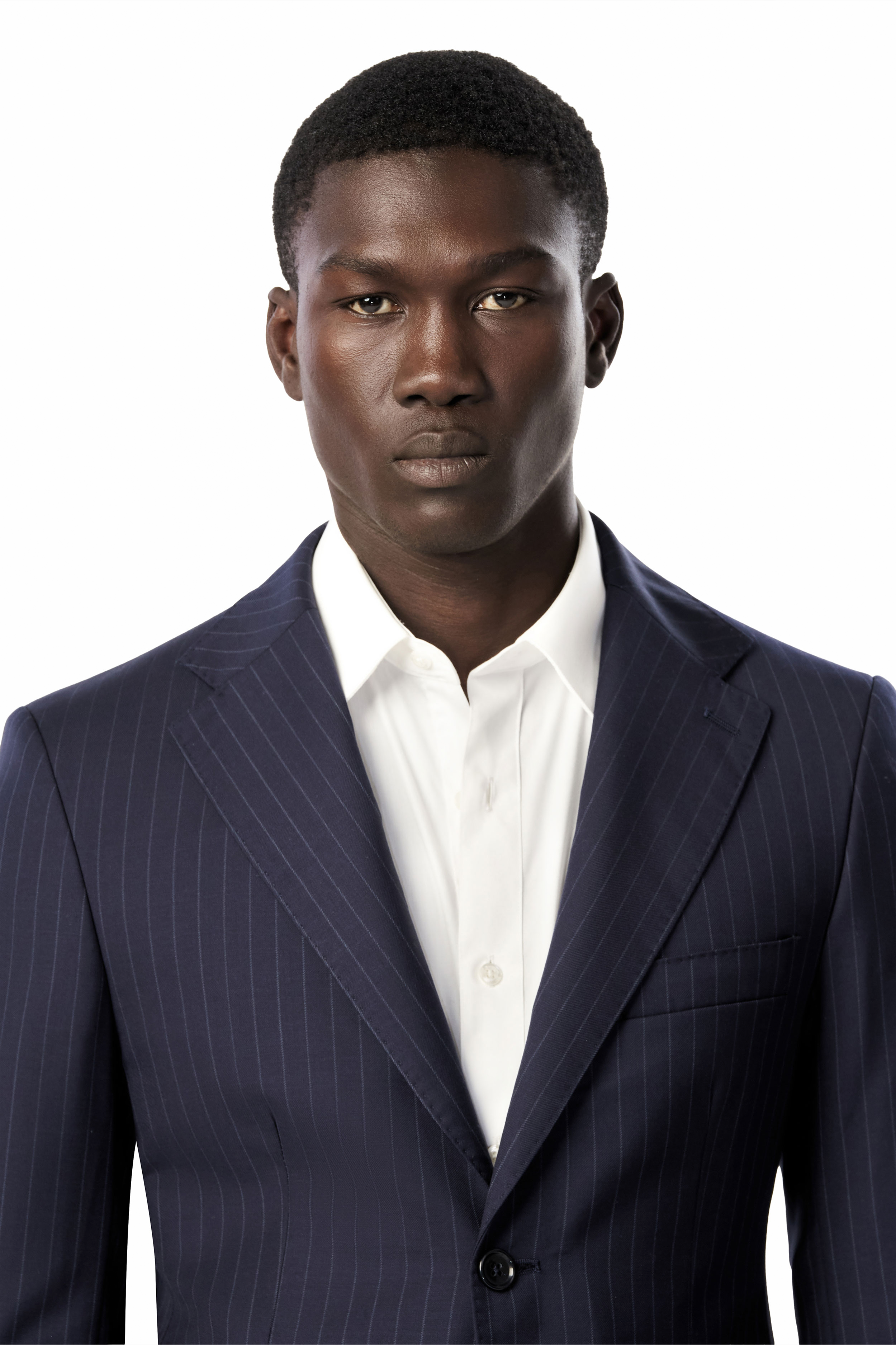 The Classic Navy Pinstripe suit from The Heritage Collection is a versatile masterpiece, perfect for weddings, corporate settings, or formal gatherings. For a timeless look, pair it with a crisp white dress shirt, a solid red or silver tie, and polished black oxfords. For a contemporary edge, try a light gray or pale blue shirt with a patterned tie to complement the suitβs refined pinstripes. This suit effortlessly adapts to your personal style, ensuring a sharp and sophisticated appearance.