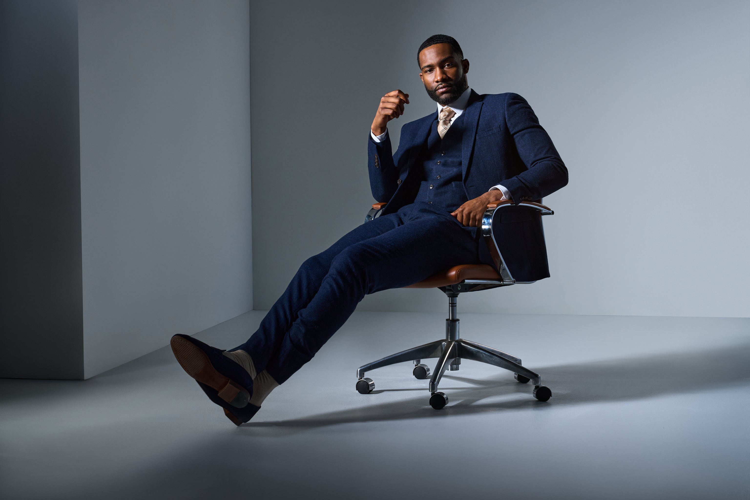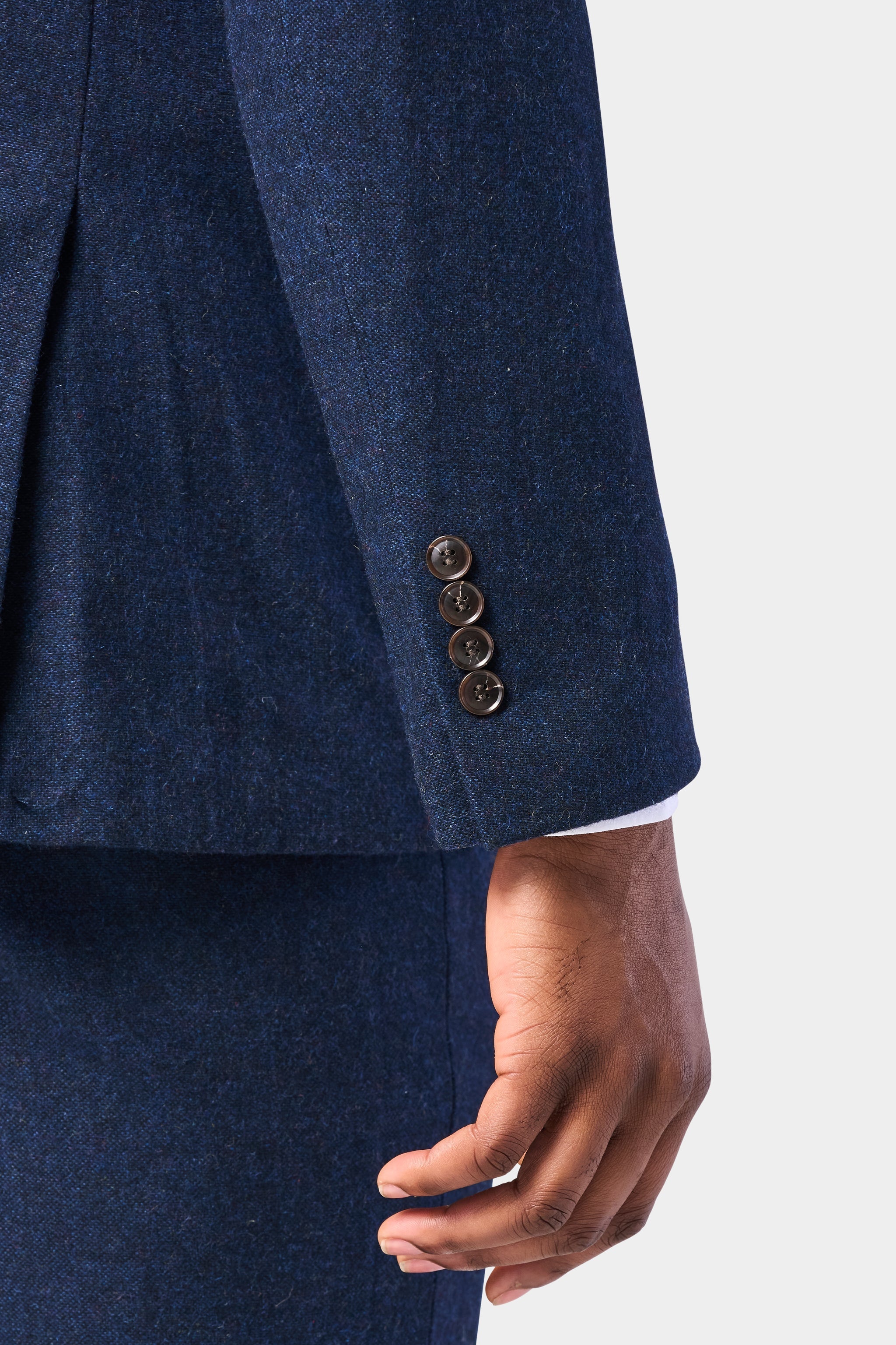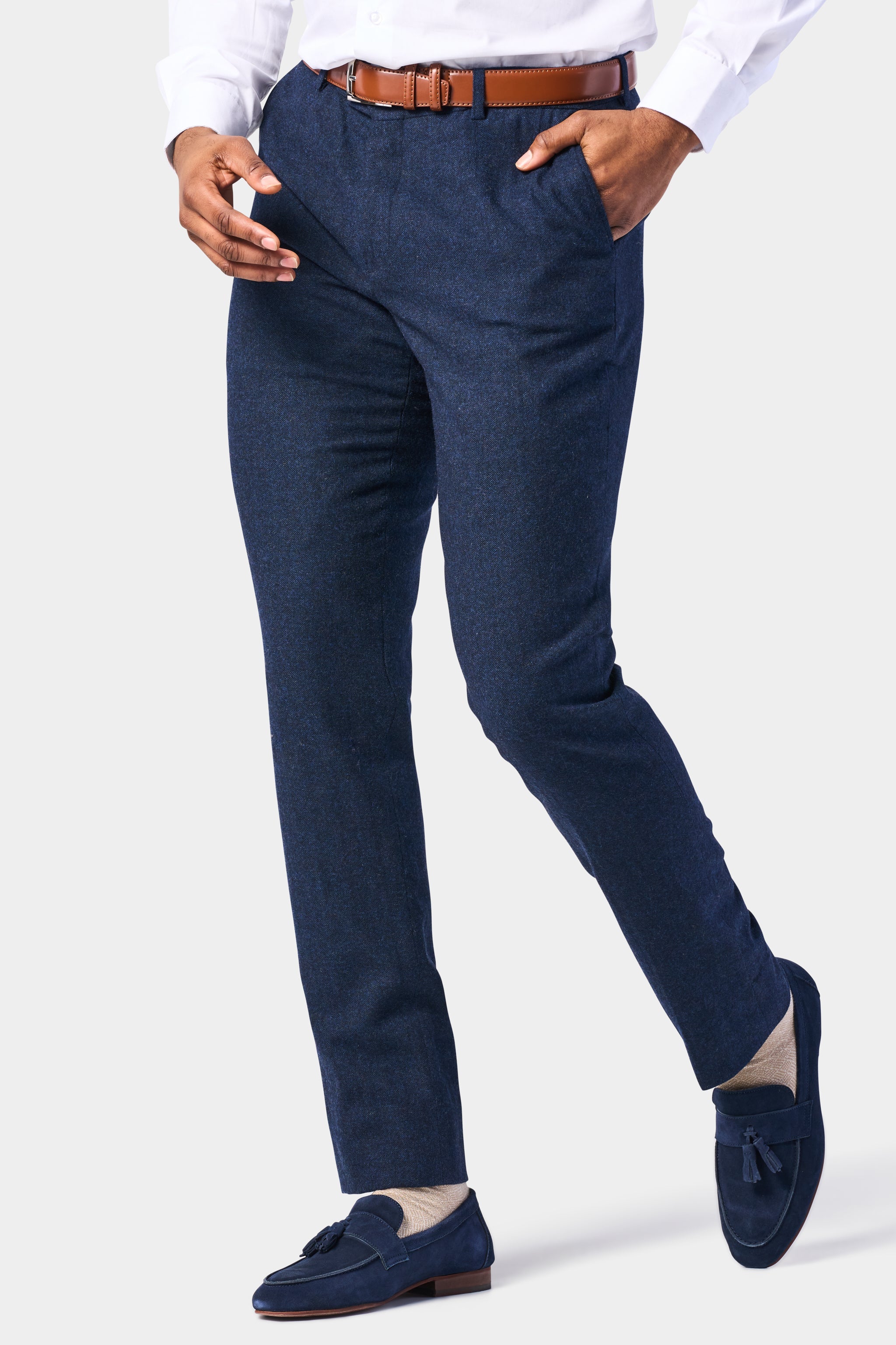 Furthermore, this refined dark blue three-piece suit provides a polished foundation for a variety of looks. For traditional flair, wear it with a crisp white shirt, silver tie, and smooth oxfords. For a modern edge, pair it with a fitted shirt, skinny tie, and monk-strap shoes. However you style it, this navy tweed suit has you looking sharp and stylish.