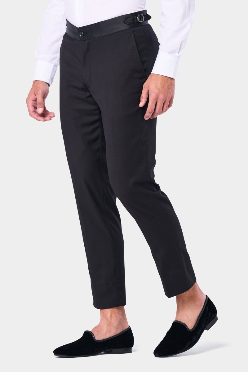 Details and Features The single-breasted jacket features a shawl lapel and four-button detailing on the sleeves. It has a slim fit to highlight your physique and elevate your look. The jacket also has jetted pockets, a chest pocket, and no vents in the back. The pants are unhemmed, so you can customize them to your preferred length.