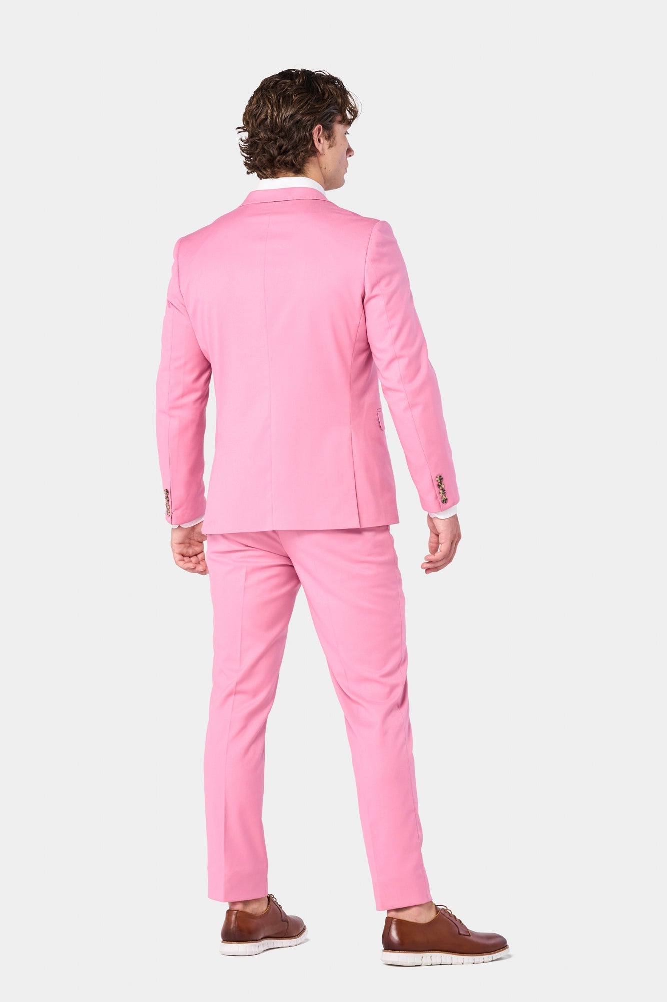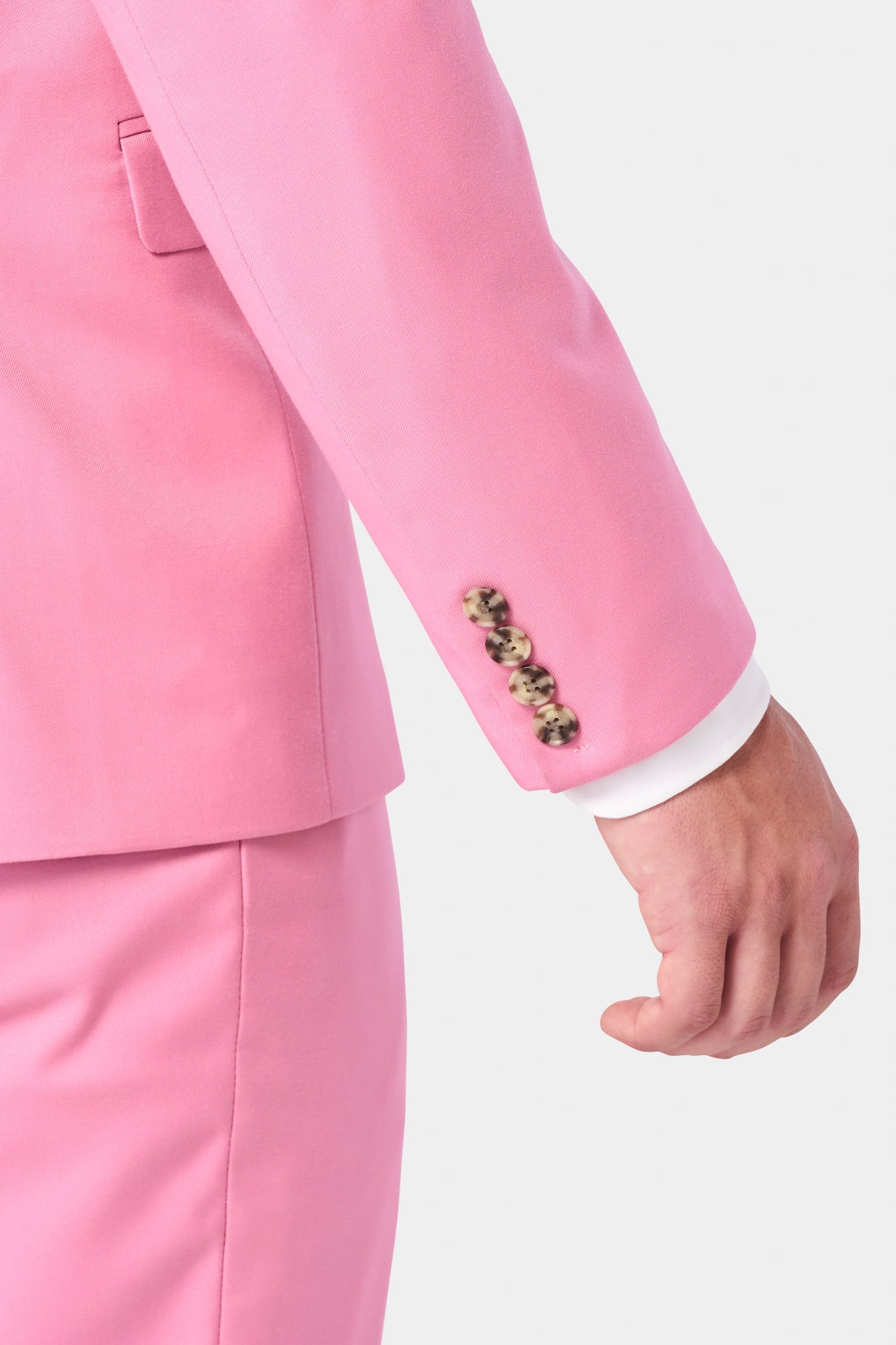 The salmon pink jacket is skillfully crafted with padded shoulders and a smooth two-button closure, creating a sharp shape. The jacket also has a chest pocket, four-button cuffs, and two flap pockets. The pants are perfectly fitted at the hips with unfinished hems, ready for custom tailoring.