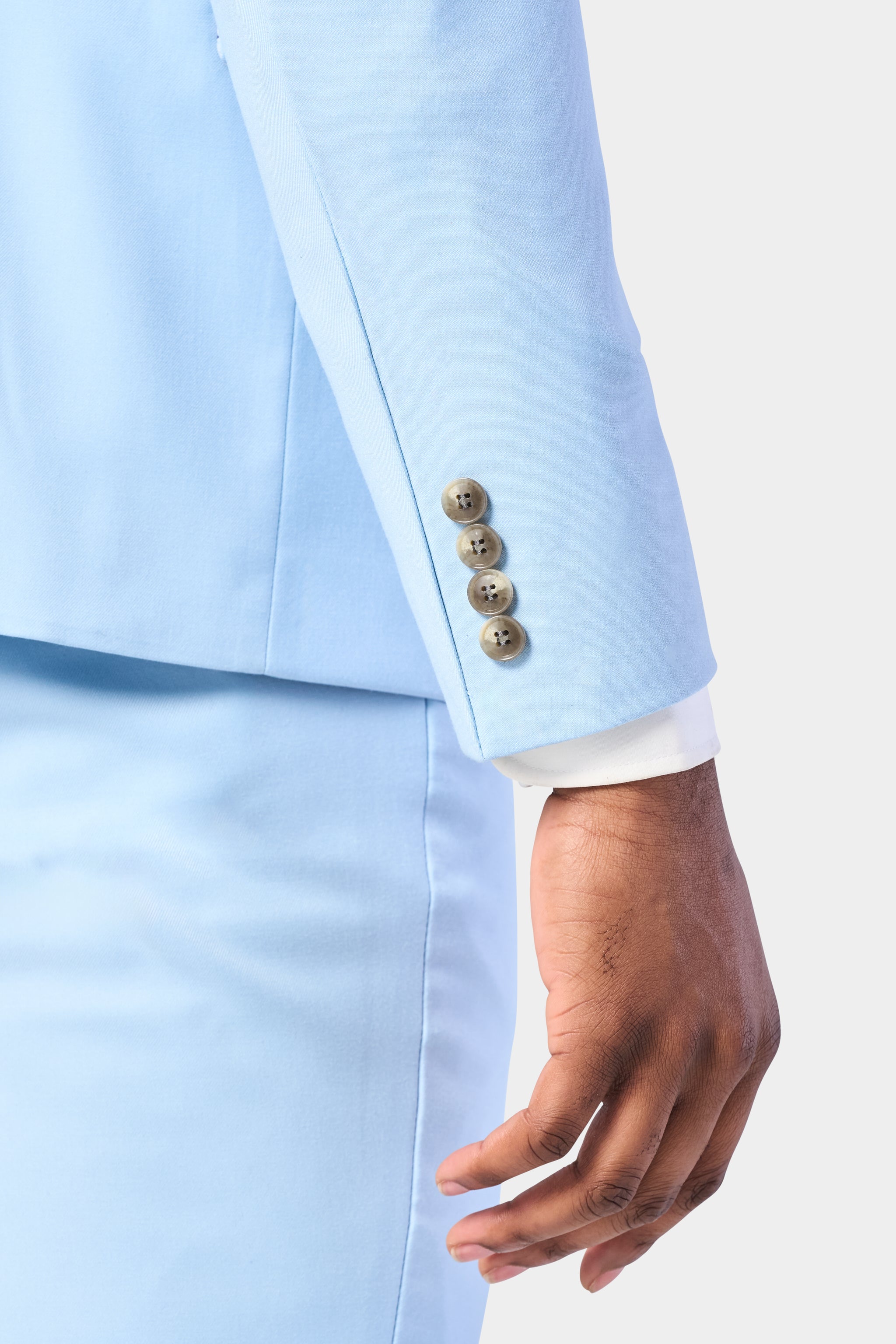 Stand out from the crowd in this refreshingly stylish sky-blue two-button suit. Perfect for spring and summer weddings, garden parties, or any occasion calling for a dapper yet breezy look, this suit will have you feeling confident and cool. The suit is skillfully tailored and features versatile color, which allows you to style it in countless ways, always looking stylish and cool.