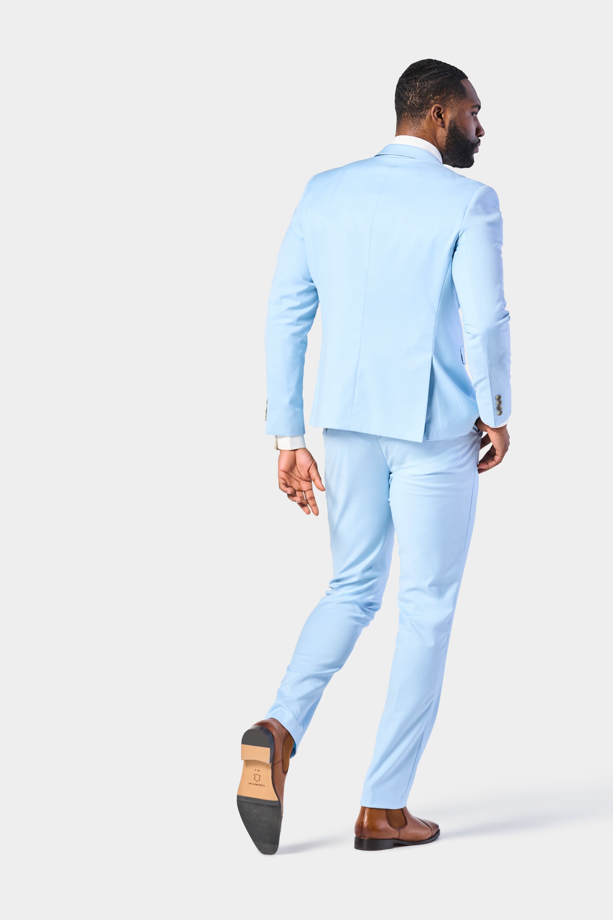 The tailored sky blue jacket comes with a two-button front closure with a classic notched lapel collar. The fit is slim yet comfortable with angled flap pockets and lightly padded shoulders. Also, it comes with double rear vents for ease of movement. Four-button cuffs and a luxurious teal patterned lining complete the premium construction. The flat-front pants also feature unfinished hems which allows you to customize the length to suit you.