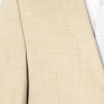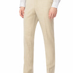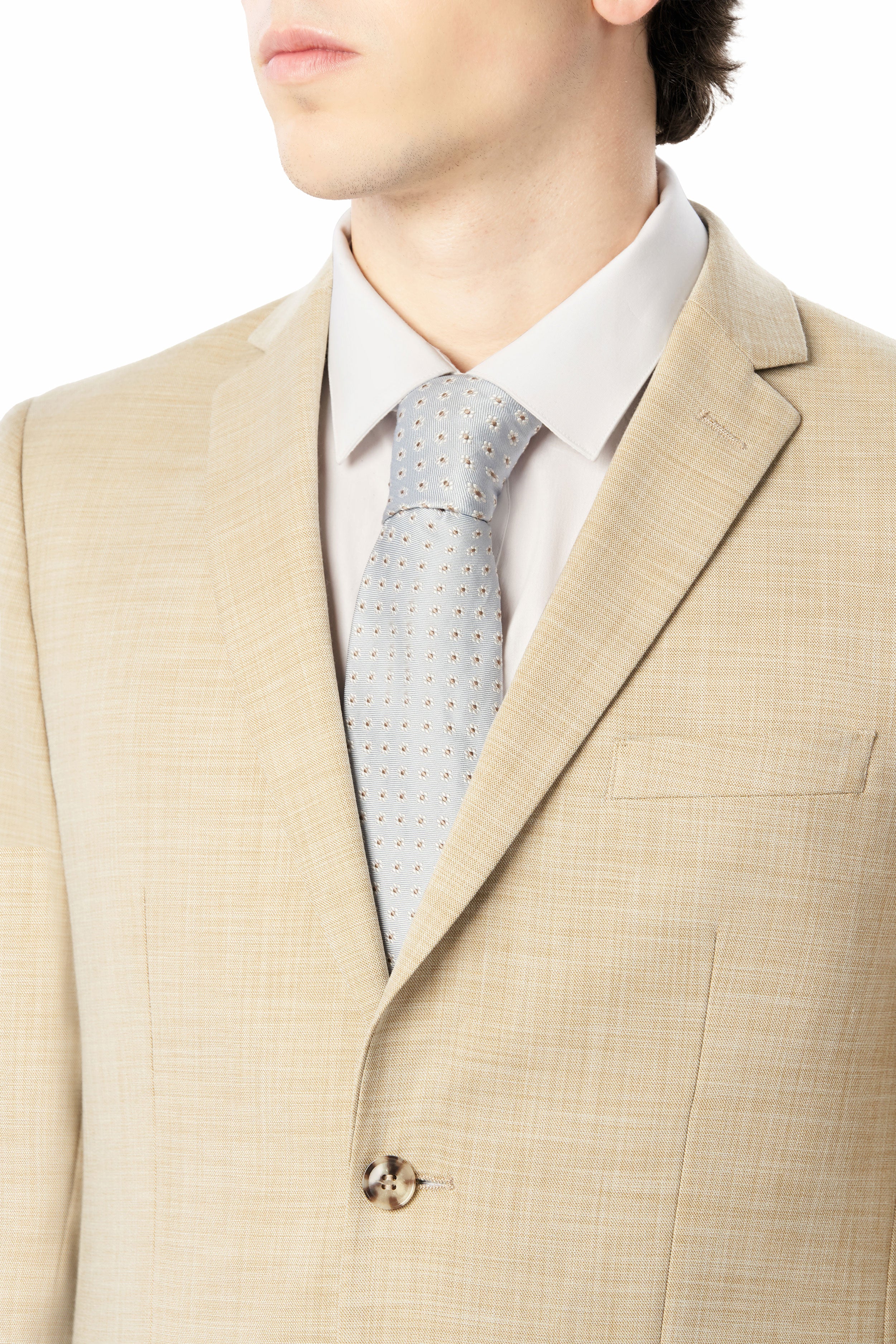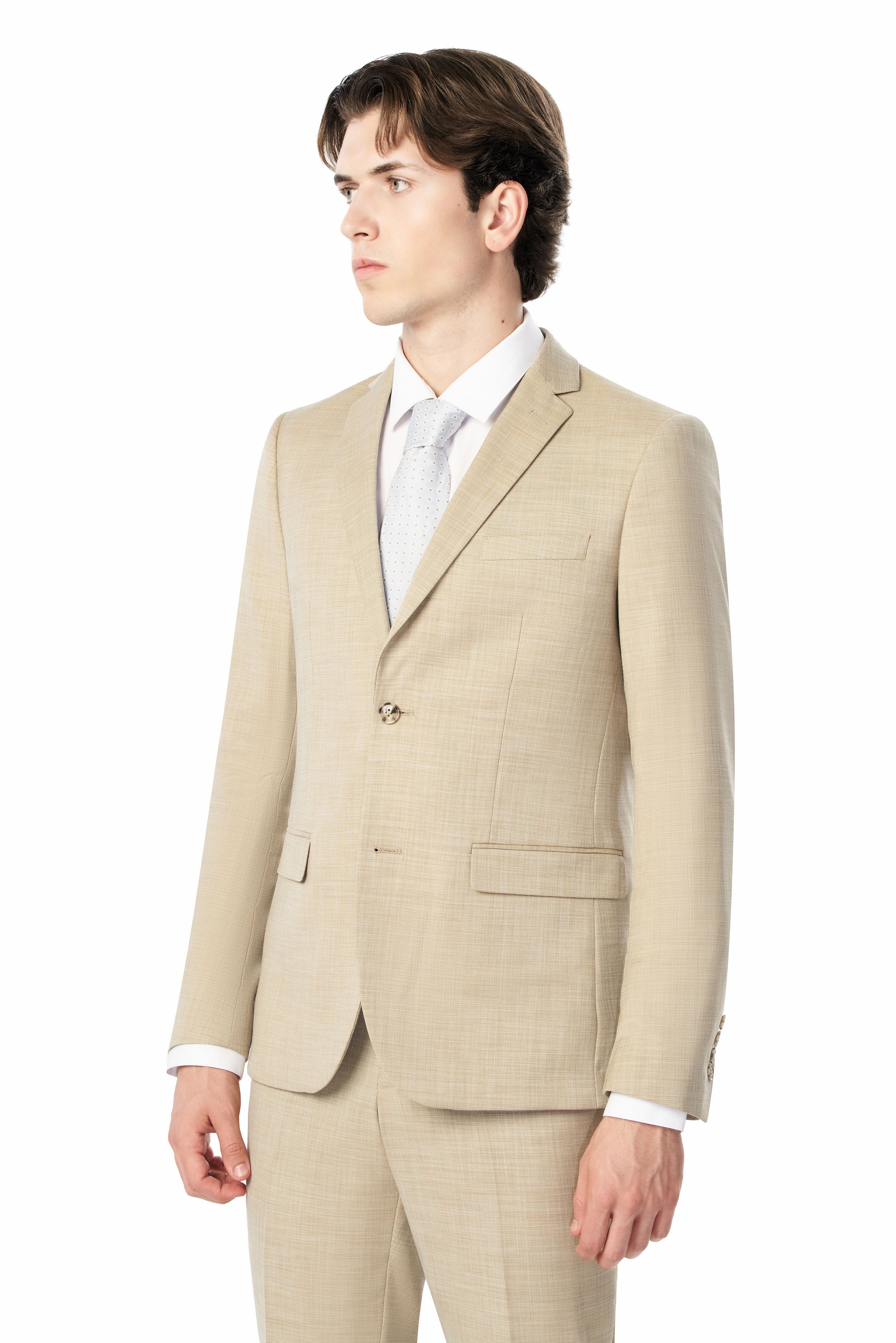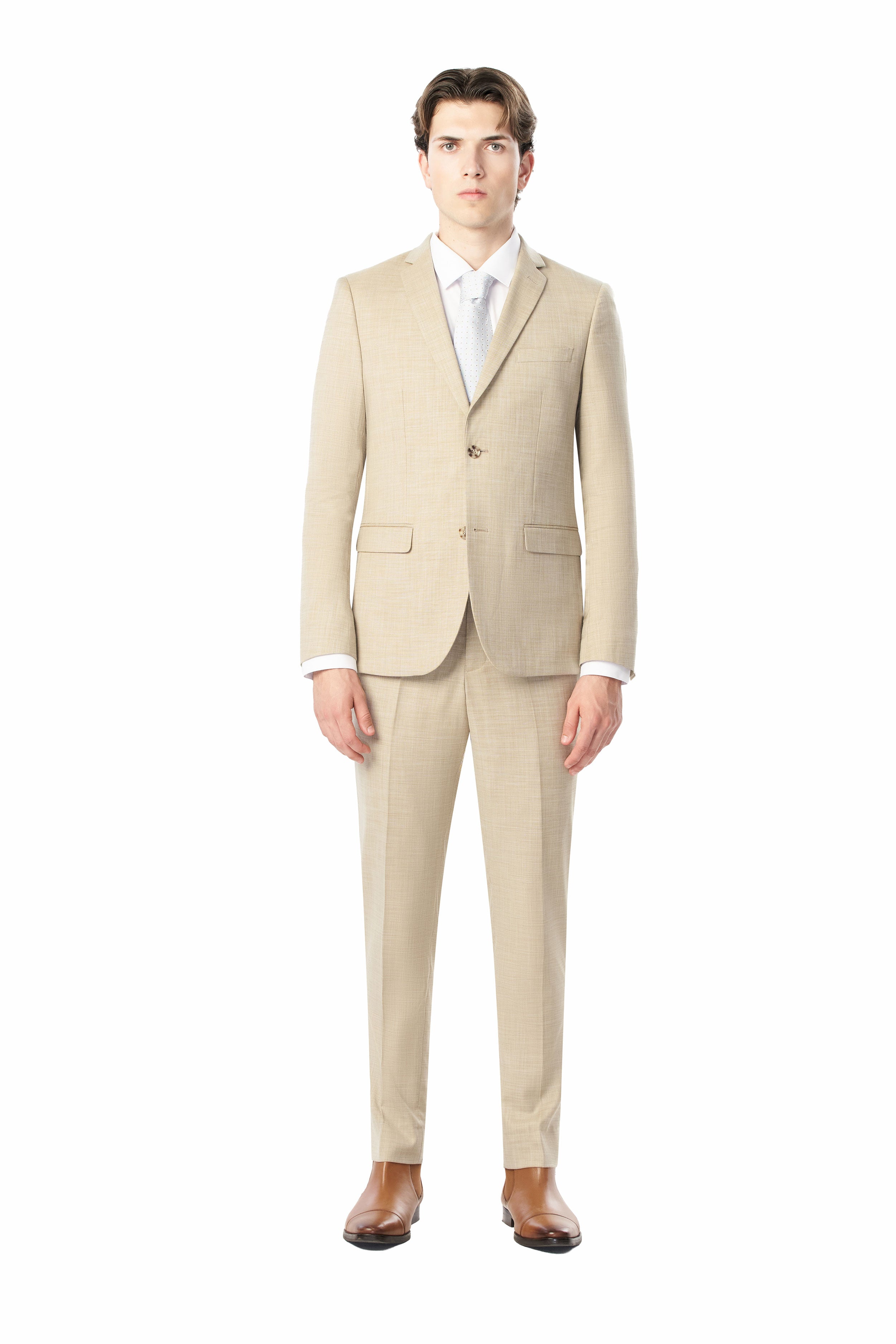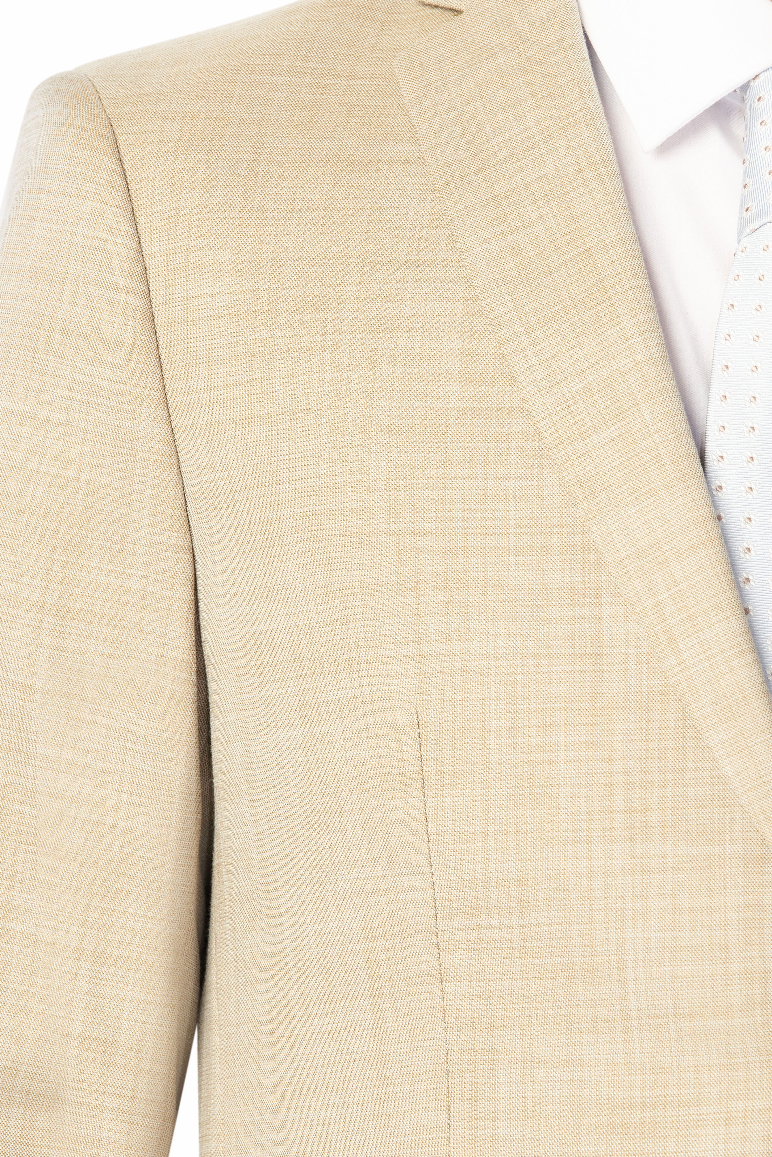 Look sharp and command attention in this expertly crafted tan sharkskin suit. This refined tan sharkskin suit is crafted to make a polished impression on professional and formal occasions. Meticulously designed with a classic notched lapel collar and two-button closure, it provides a tailored, timeless silhouette. The subtle sharkskin texture adds depth and visual appeal. With a weave and look similar to linen, this suit is perfect for destination weddings. Crafted from a polyester-rayon and spandex blend, the fabric delivers exceptional durability, comfort, and wrinkle resistance.