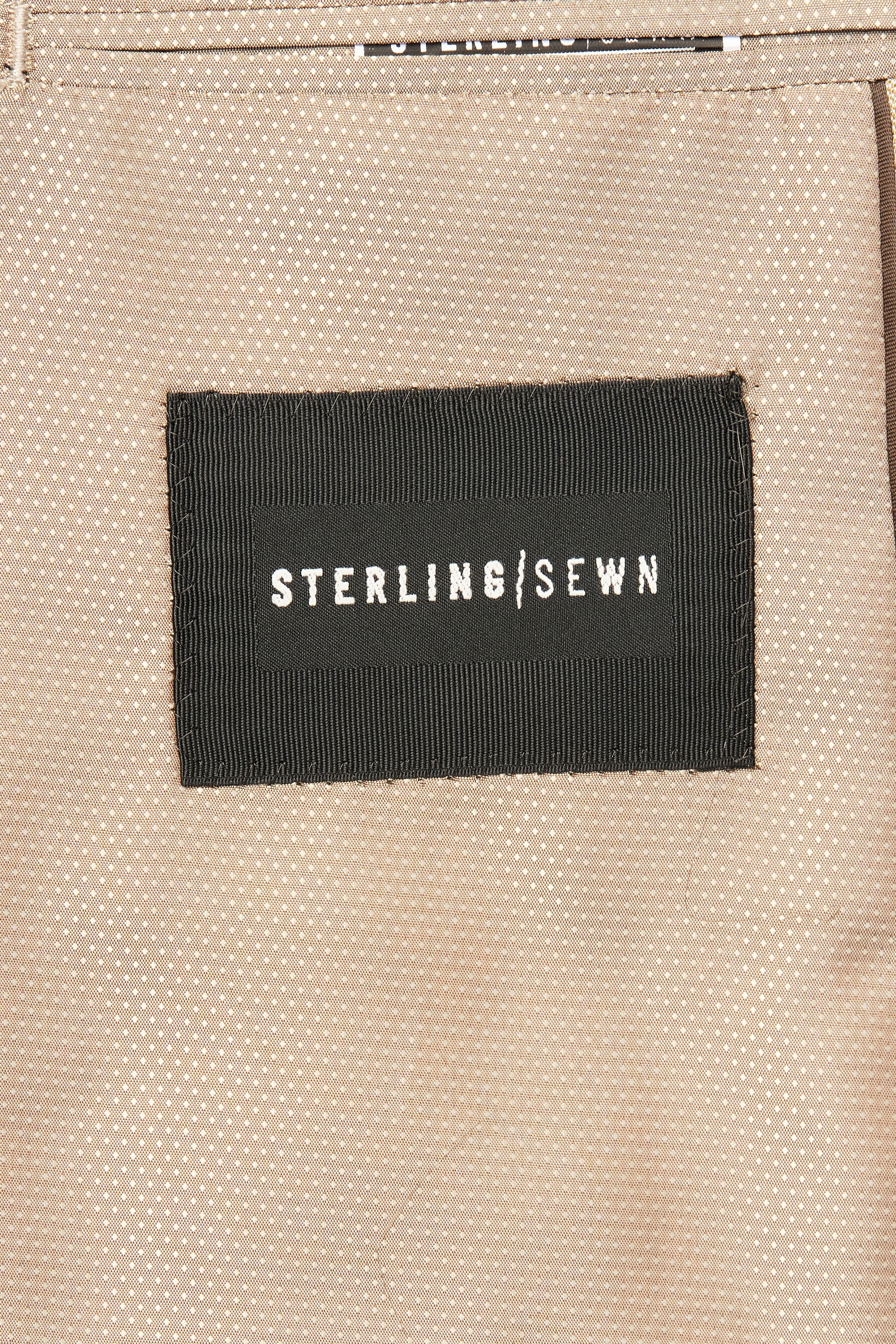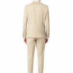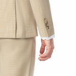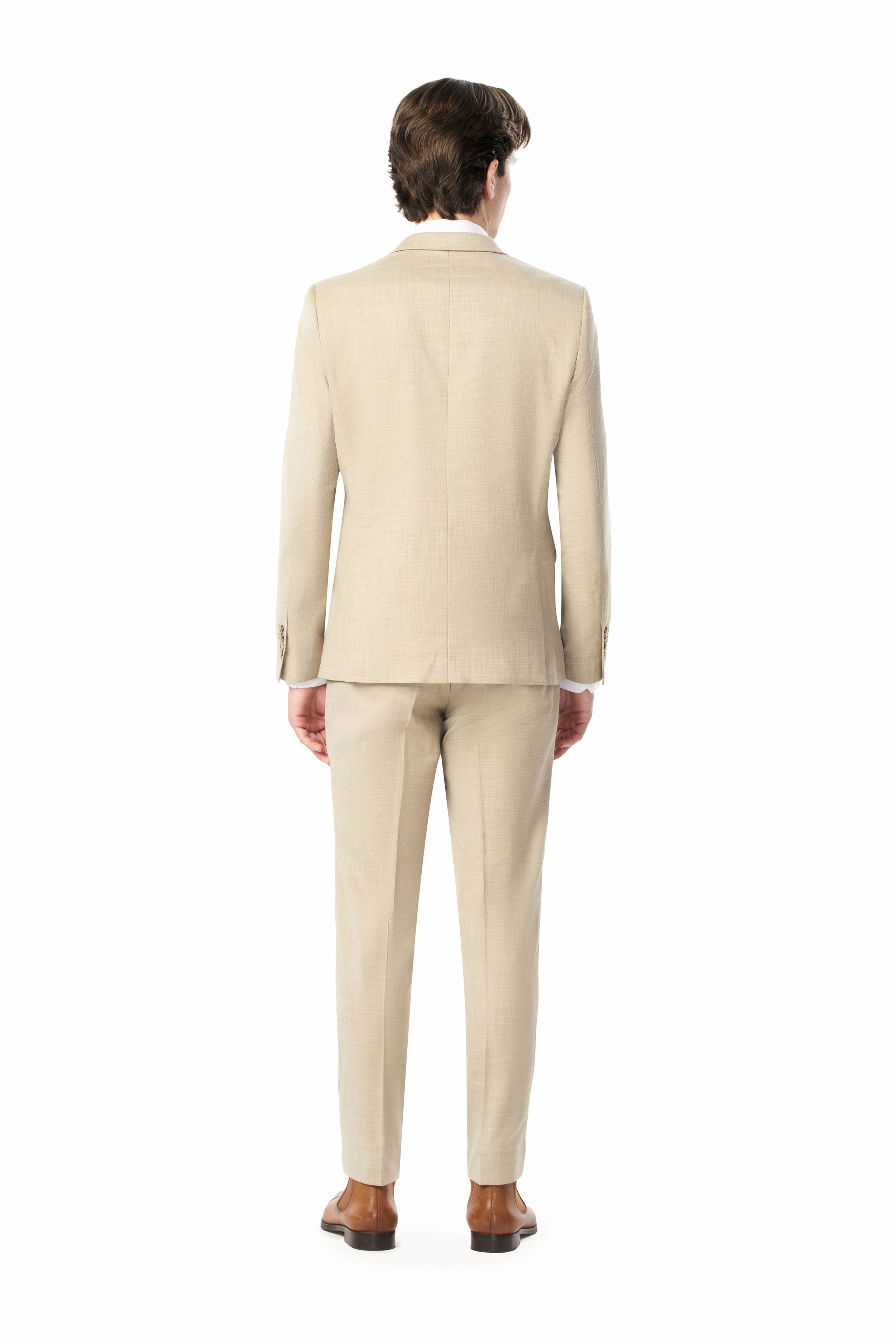 The tan jacket features a two-button front closure, four-button cuffs, padded shoulders, and double side vents at the back for ease of movement. The matching flat-front pants sit cleanly on your hips with unfinished hems ready for custom tailoring to your preferred length.