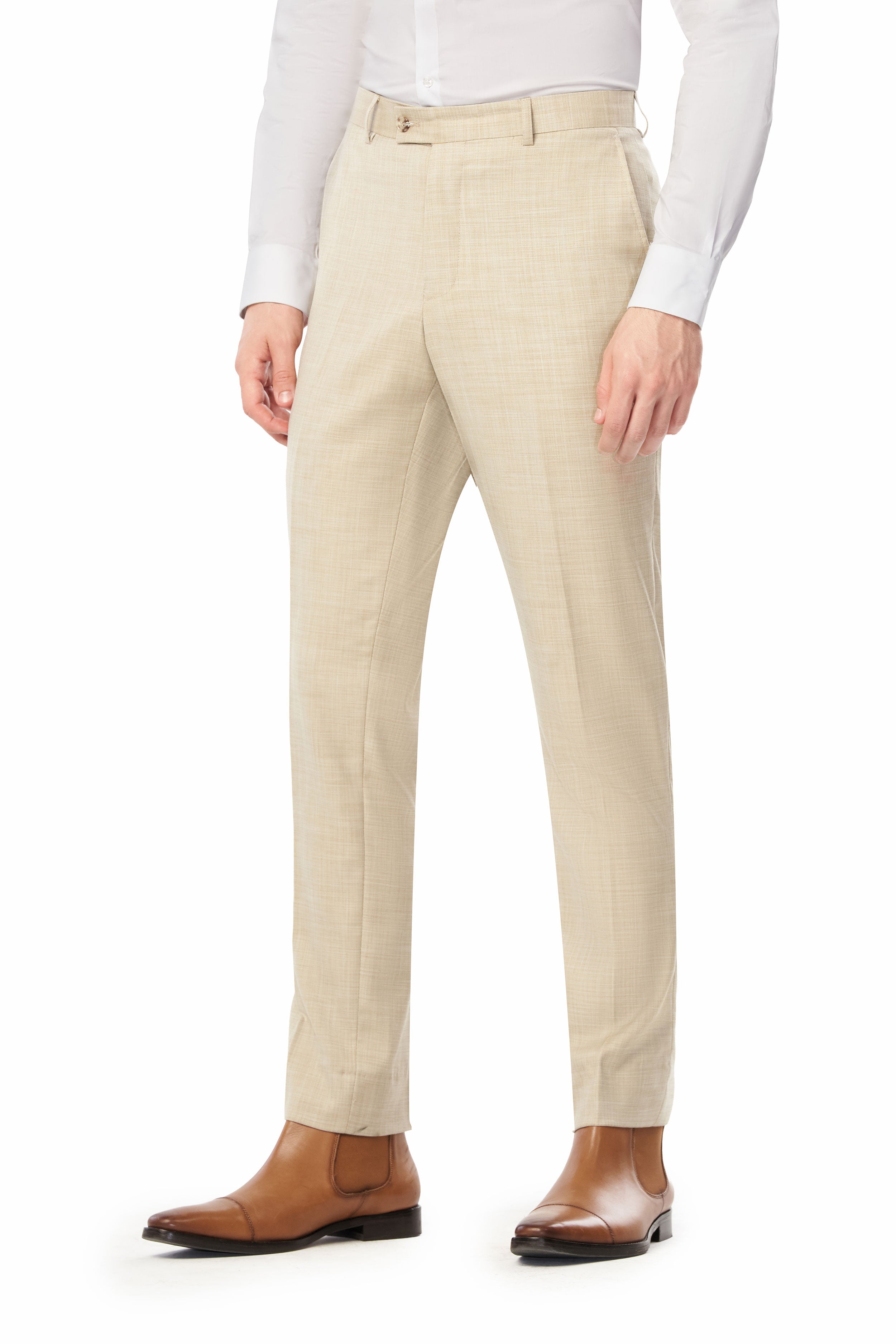 The polyester, rayon, and spandex fabric with a sharkskin weave has a subtle tonal pattern that resists creases and wrinkles. Thus keeping you looking sharp all day and night. The material contains stretch to allow flexibility while maintaining the slim, tailored shape. Also, the versatile tan color pairs well with various shirt and tie combinations.