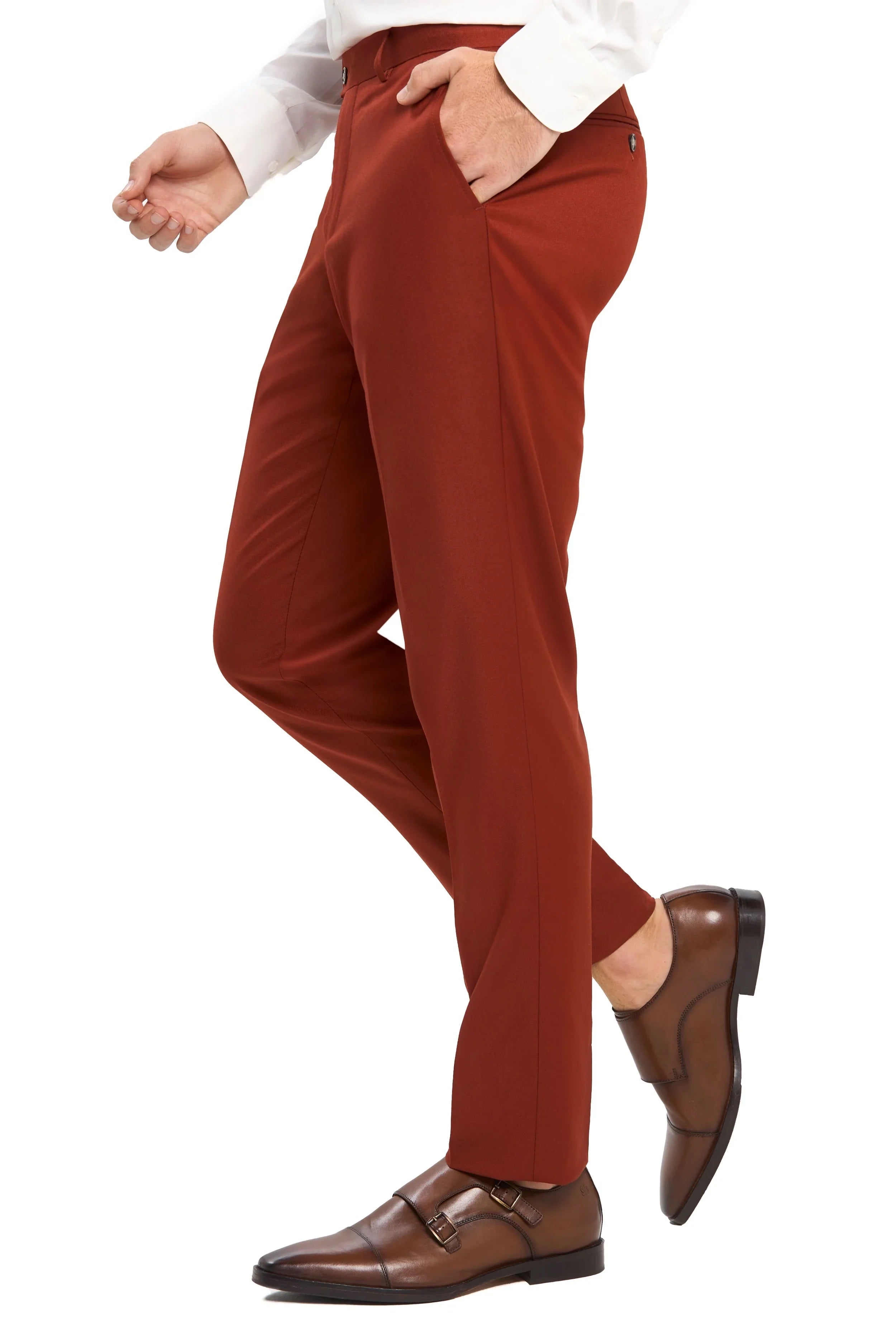 What's more, it is quite easy to style this suit. Dress it up with a crisp white shirt and polished shoes for a formal event. Alternatively, you can keep it relaxed with a patterned shirt and loafers for a weekend event. The terracotta seamlessly transitions from season to season, making it a year-round staple in your wardrobe.